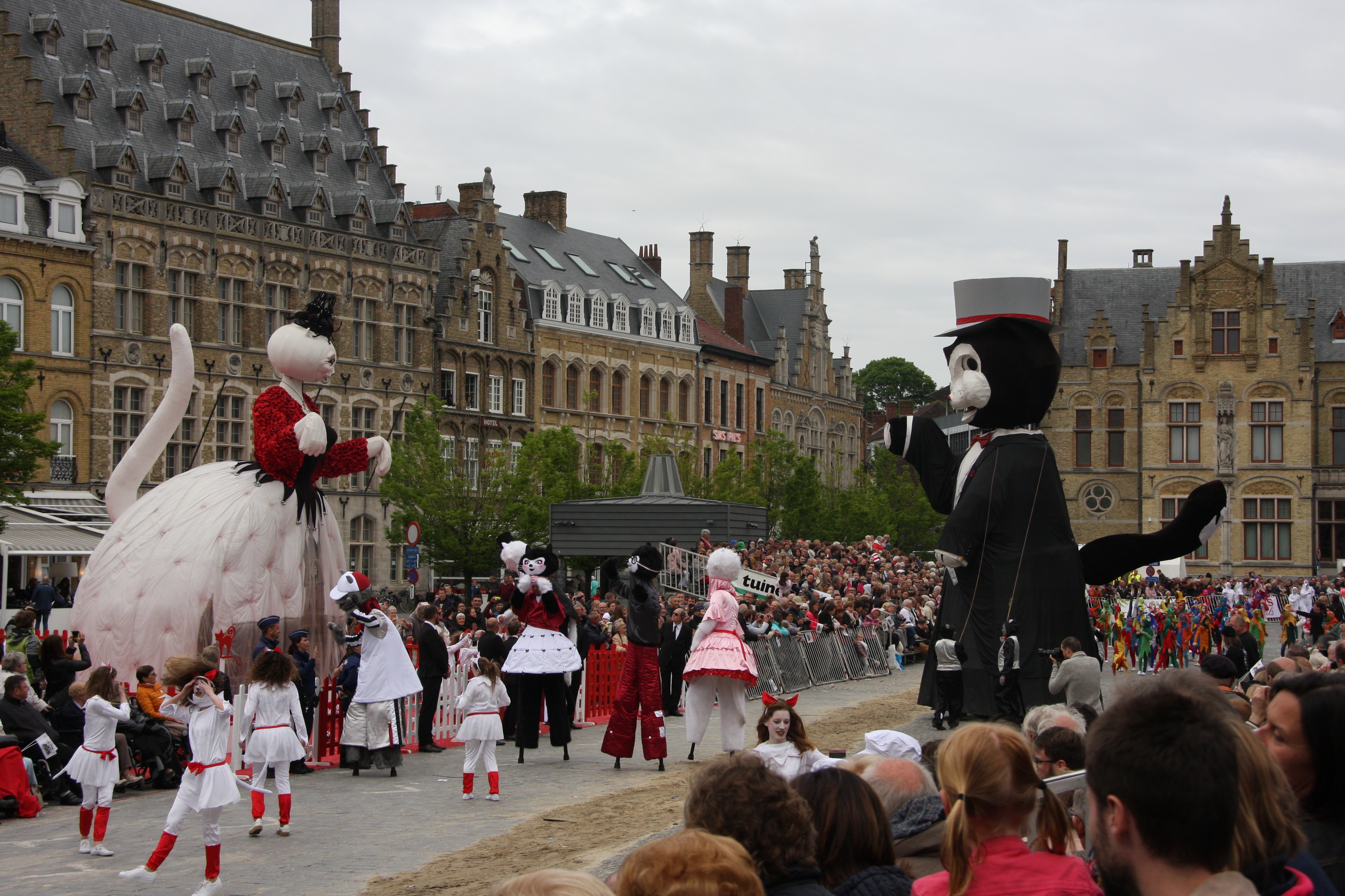 Namiddag: Na ons middagmaal nemen we plaats op de tribune op de Grote Markt. De Kattenstoet is een driejaarlijkse stoet in Ieper waar, zoals de naam dat laat vermoeden, de kat centraal staat. Ieper wordt, naast Vredesstad, De stoet bestaat uit een gigantische en kleurrijke optocht, gewijd aan de kat. Ook lopen er heel wat reuzen mee, zoals de kater Cieper en het pronkstuk Minneke Poes, de jonge Pieper, de kattenwagen van de ‘Keltische’ godin Freya, Goliath, Nicolaas de Kanonnier, Pietje Pek... De optocht is onderverdeeld in verschillende hoofdstukken. Elk hoofdstuk wordt aangekondigd door kinderen die een titelbord dragen. Korte tijd nadat de laatste wagen en figurant van de stoet gepasseerd zijn, verschijnt de stadsnar op een platform op de belforttoren. De nar ruit het publiek op en gooit dan pluchen katjes in de menigte. De kattenfeesten worden afgerond met de veroordeling en verbranding van de heks op de Ieperse Grote Markt.