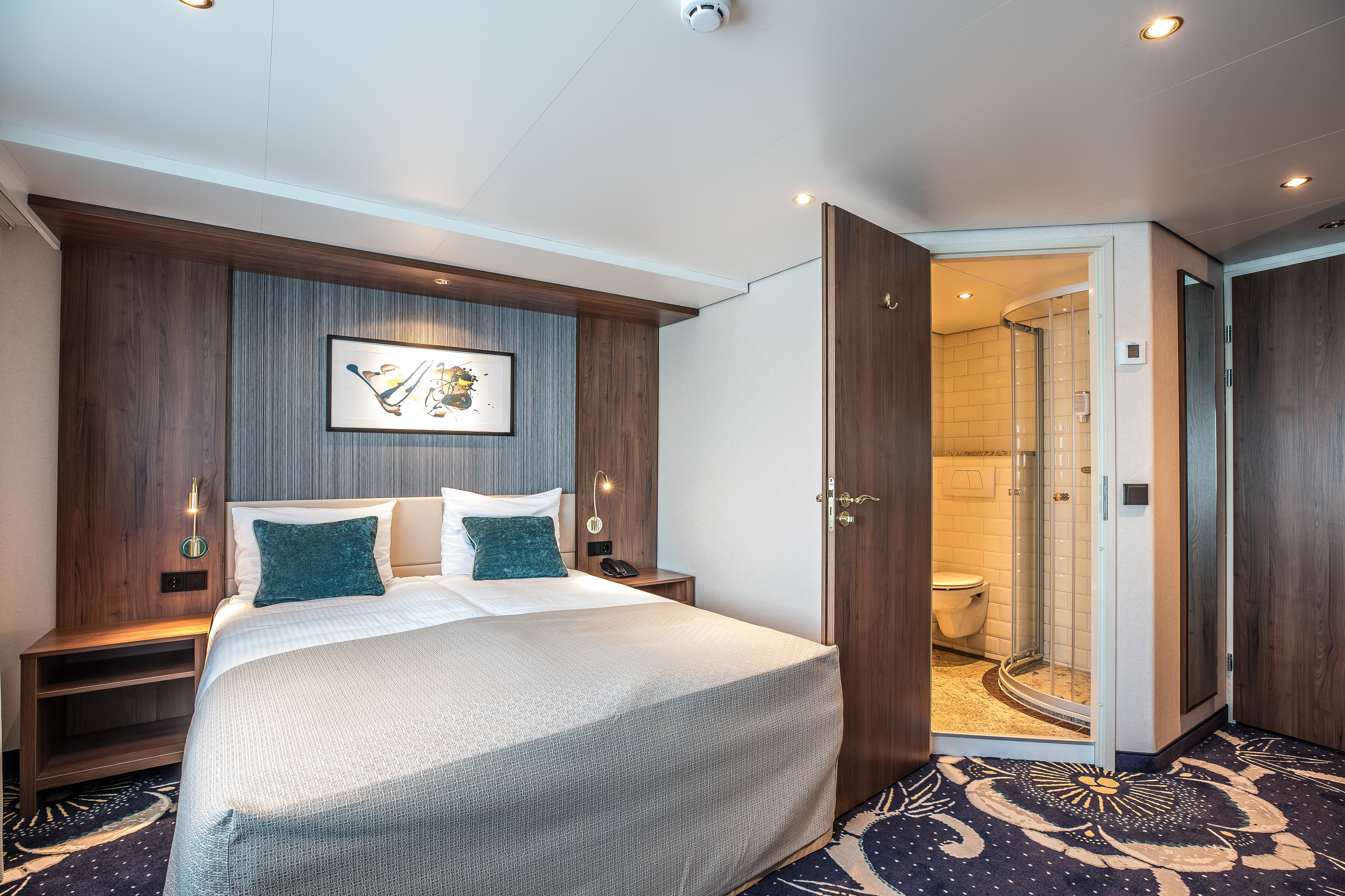 Kajuiten: ruime & smaakvol ingerichte buitenkajuiten met douche, toilet, föhn, tv, telefoon, ruime kast en kluis. Op het Diamant Dek hebben alle kajuiten een Frans balkon.